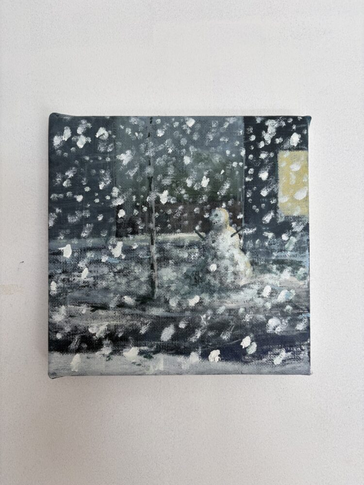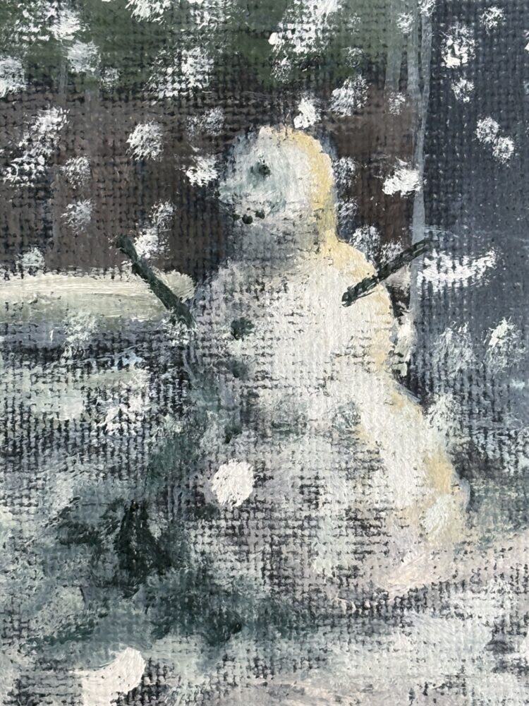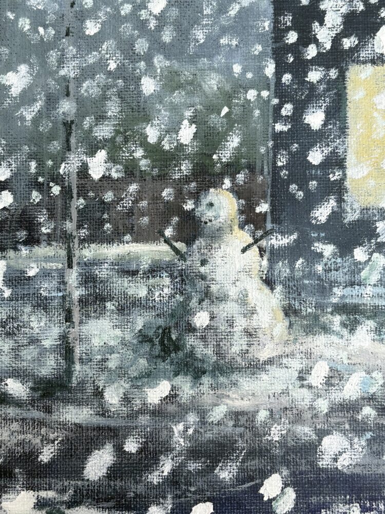 This painting is about the snowman in my street. Snowmen are those made and given life by children and some grown ups that still like to play.