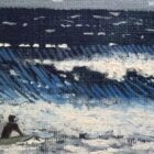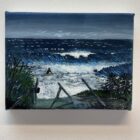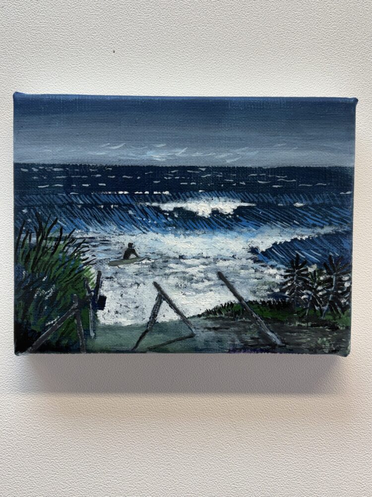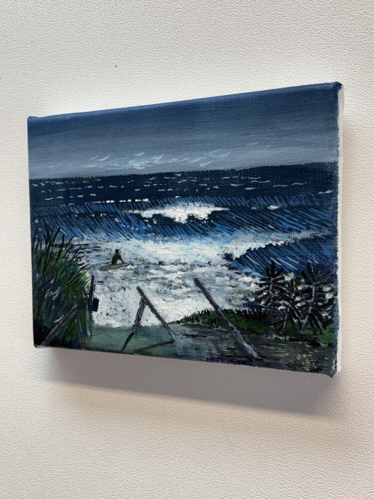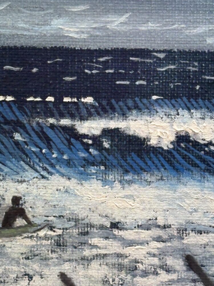 This painting is about a cold winter surf session with clean waves in offshore wind. This winter I didn’t go out a lot, but the feeling of surfing in this winter circumstances and a warm coffee with apple pie afterwards is fantastic. This is the moment of getting in.